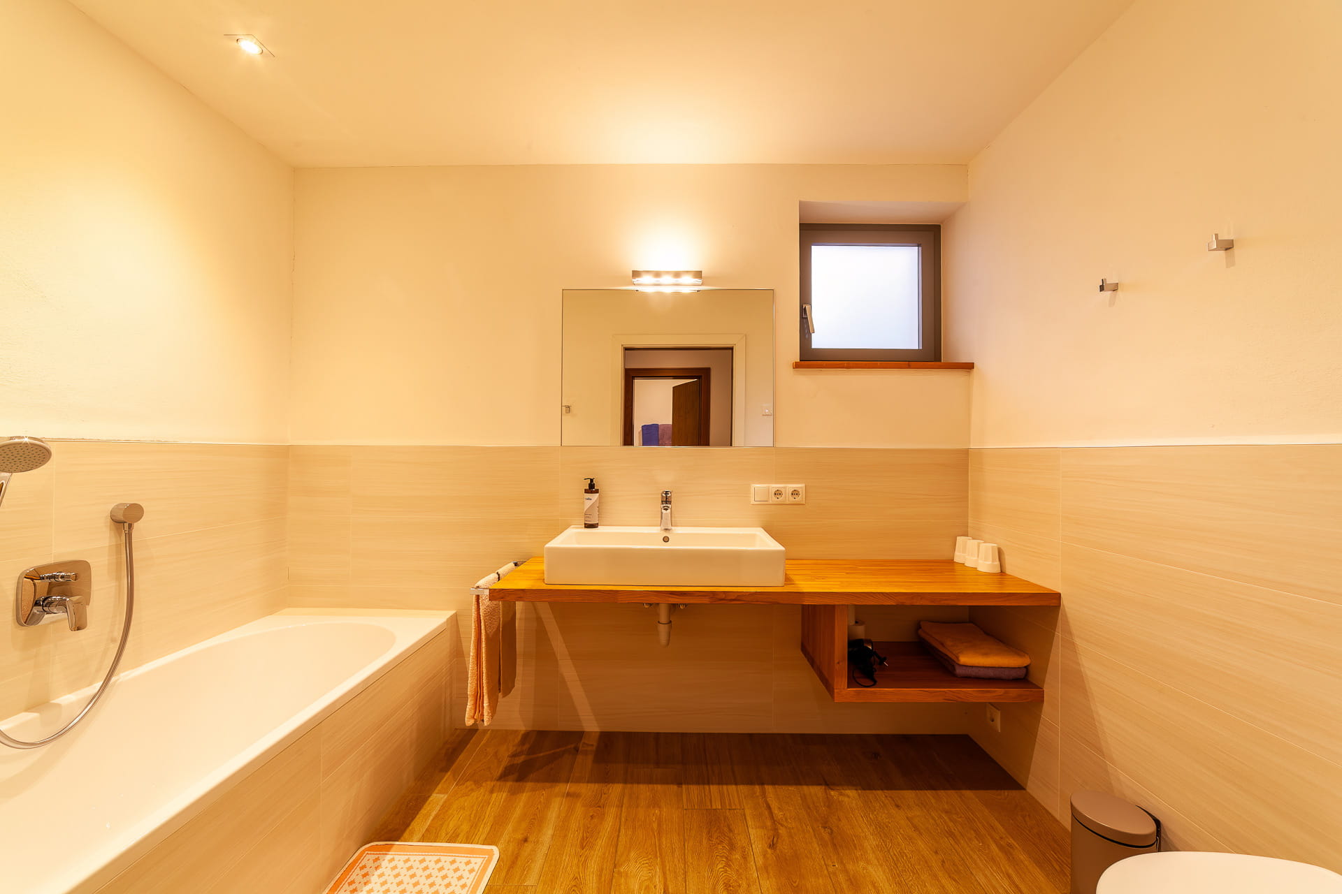 L’appartamento ad Aldino ha due bagni: uno grande con vasca da bagno e uno piccolo con doccia.